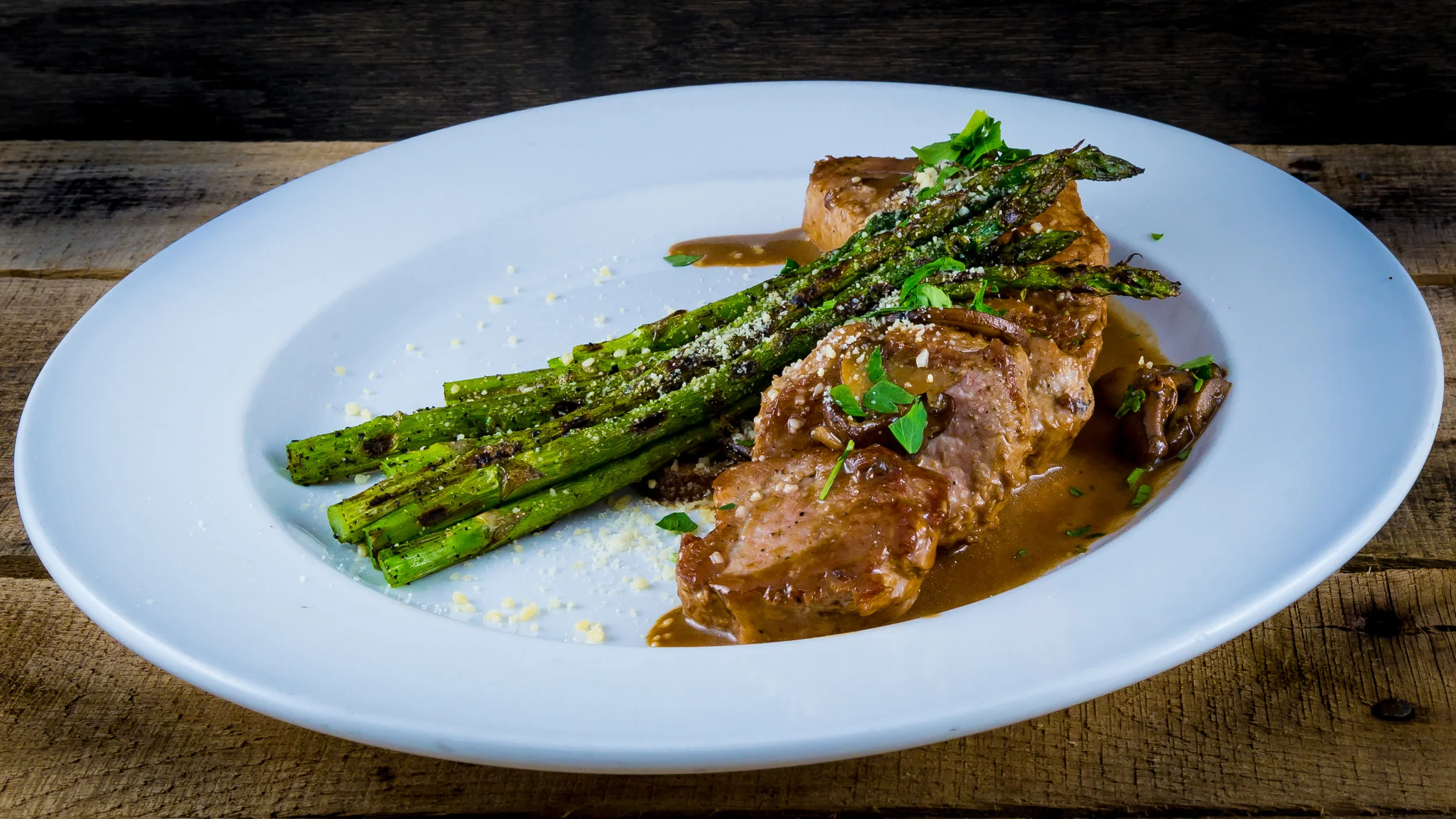 8 oz. Lightly Breaded Chicken Breast topped with Mozzarella Cheese White Wine Lemon Butter and Fresh Mushrooms served with a Choice of Side