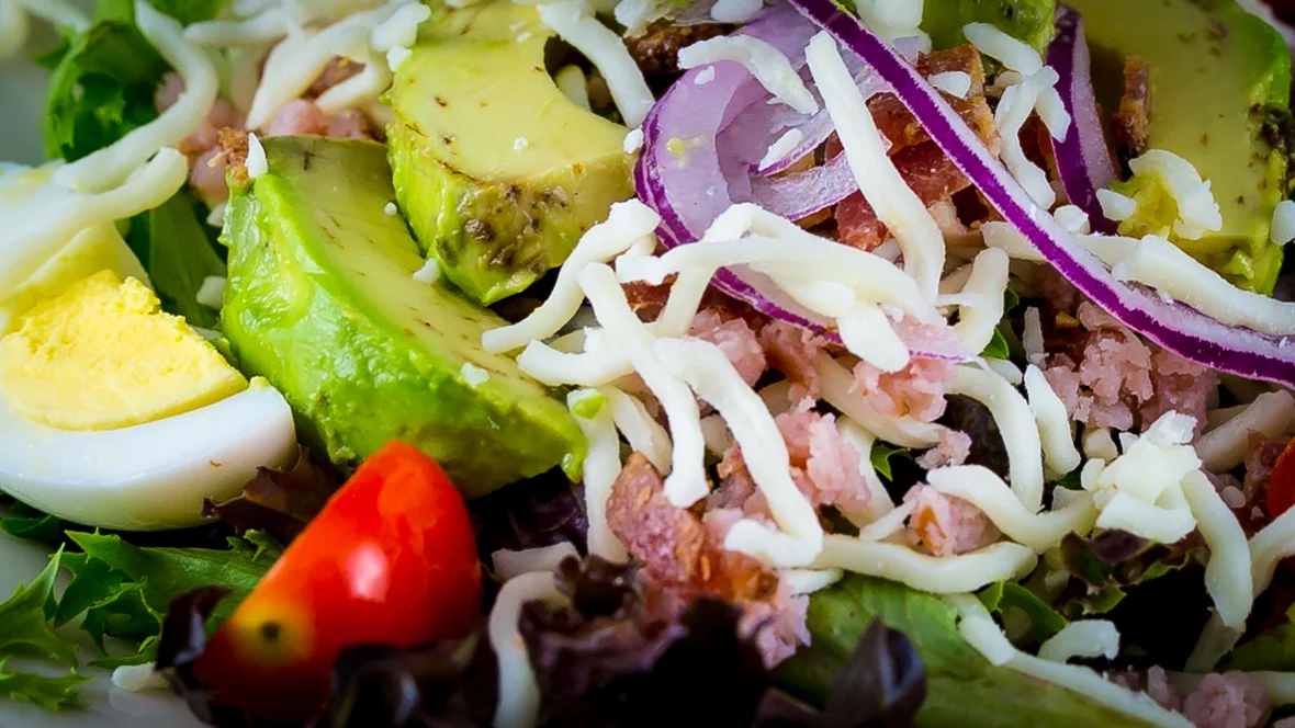 Harvest Blend Lettuce with Eggs, Bacon, Ham, Avocado, Onion, Grape Tomato, and Mozzarella Served with Green Goddess Dressing
